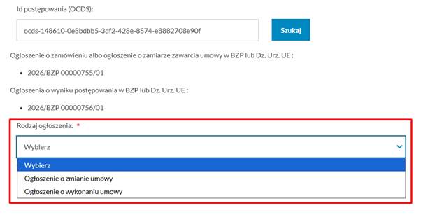 W przypadku postępowania w procedurze krajowej na liście rozwijalnej dostępnych rodzajów ogłoszeń dostępne jest ogłoszenie o wykonaniu umowy i ogłoszenie o zmianie umowy.